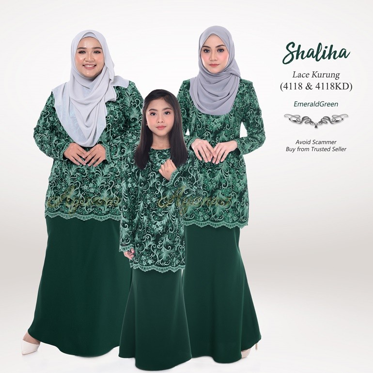 Readystock green scallop family set raya hijau baju kurung.